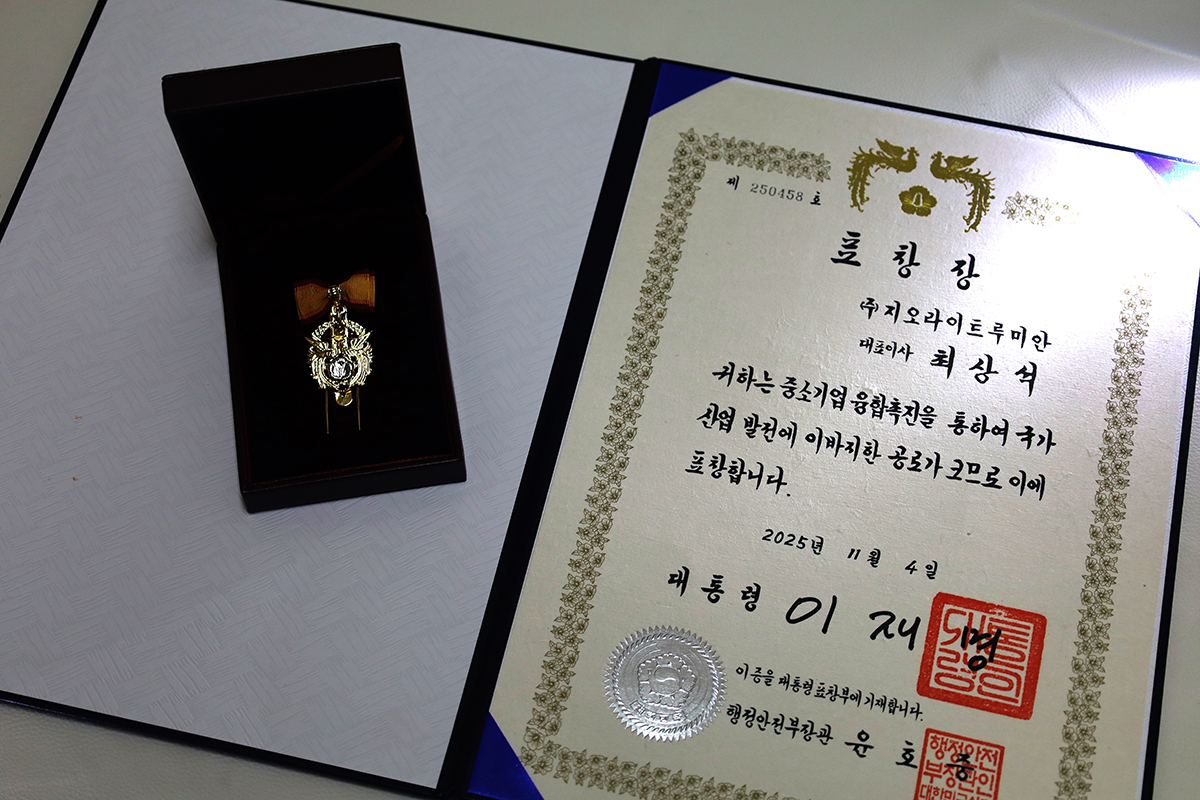 지오라이트 그룹의 최상석 회장님이 2025년 11월 4일 대전컨벤션센터에서 개최된 ‘2025 중소기업융합대전’에서 중소기업융합촉진 유공자 대통령 표창을 수상하였습니다.